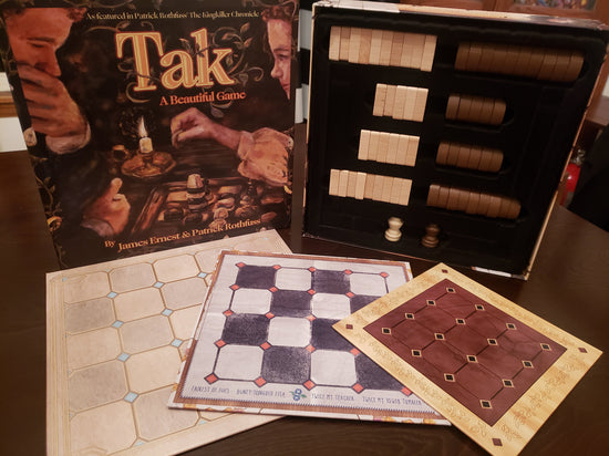 Introduced in The Wise Man’s Fear, Tak: A Beautiful Game is a 2-player strategy game invented by James Ernest of Cheapass Games and Patrick Rothfuss that is reminiscent of classics like Go and mancala.