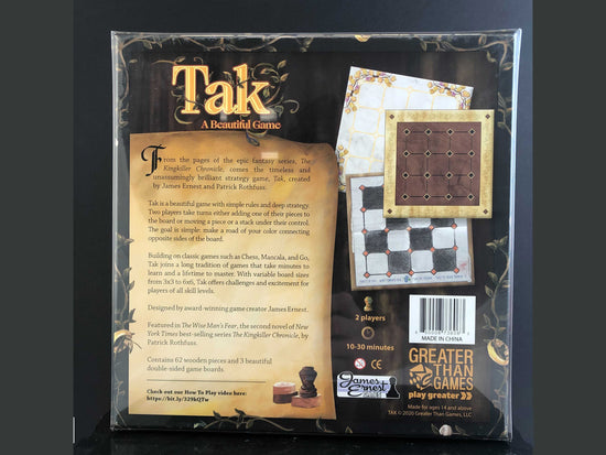 From the pages of the epic fantasy series, The Kingkiller Chronicle, comes the timeless and unassumingly brilliant strategy game, Tak. The 2nd Edition features 3 board double-sided with a courtly and tavern design, and features easter eggs throughout! This newly redesigned 2nd edition of Tak: A Beautiful Game comes packed with 62 wooden pieces as well as three beautiful double-sided boards in 5x5, 4x4, and 3x3 game layouts.
