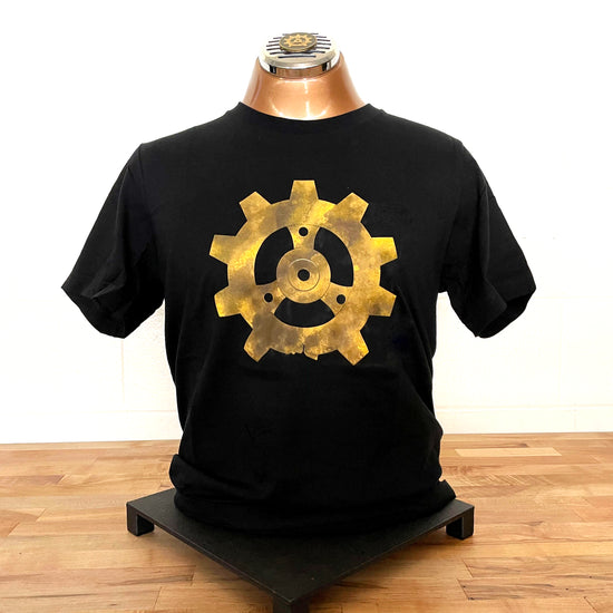 First introduced during our 2020 Geeks Doing Good Indiegogo campaign, Auri's Fulcrum t-shirt is decorated with a black mat background and brass "FULCRUM" as imagined by artist Nate Taylor based on Patrick Rothfuss' novel The Slow Regard of Silent Things.