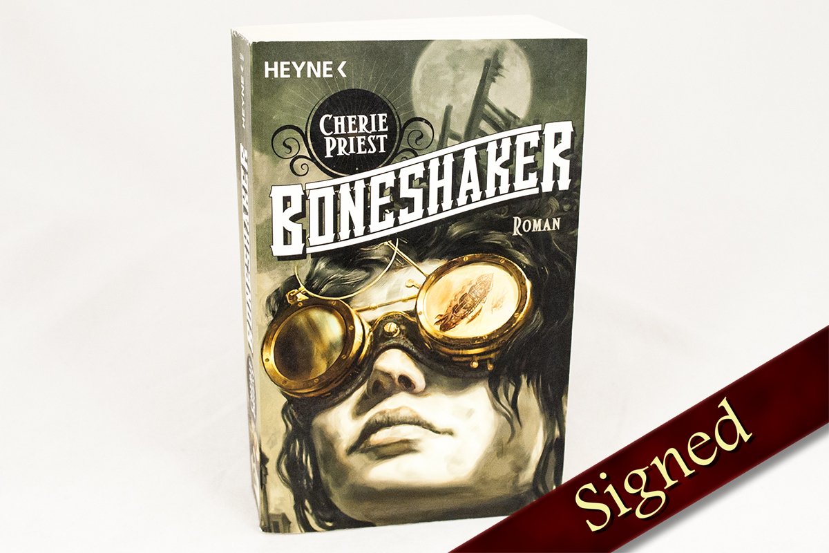 This is the German Edition of Boneshaker, the first novel in the Clockwork Century Universe. This book was generously donated to us by its author. It is available here in trade paperback and signed by its author, Cherie Priest.