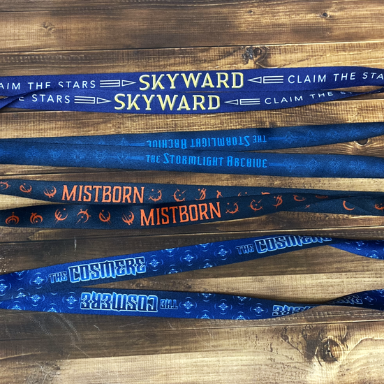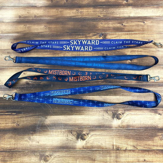 Choose from Mistborn, Stormlight, Cosmere, or Skyward! Each lanyard comes in full color, with a lobster claw clip.