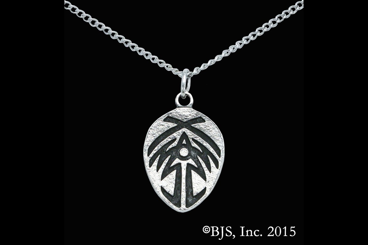 The glyph measures 34.8 mm long including the bail, 18.5 mm at the widest point, and 1.7 mm thick. The medallion weighs 4.4 grams. The back of the pendants is textured and stamped with Badali's makers mark, copyright, and metal content - sterling. Comes with a 24" sterling silver curb chain.