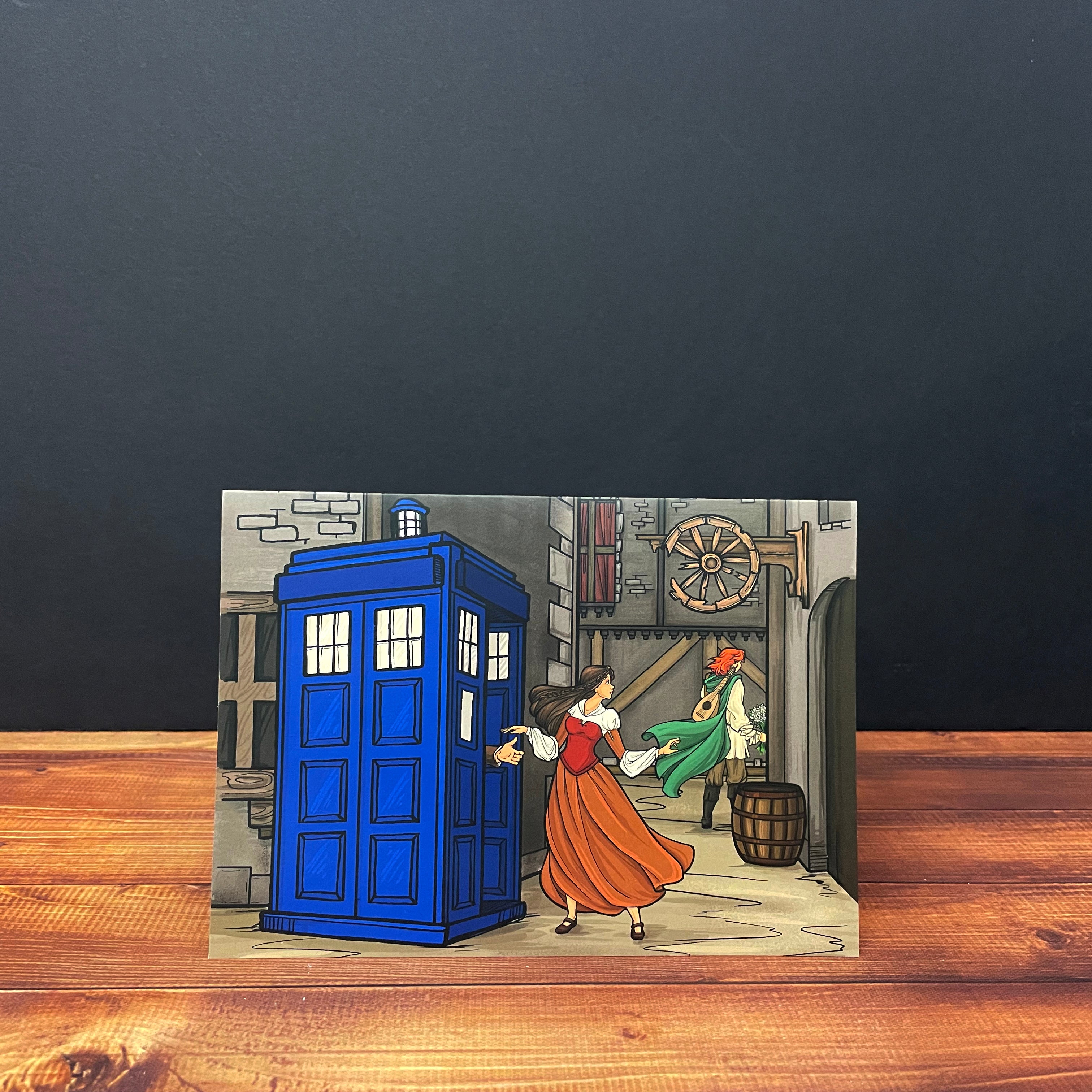 Deena reaches for an outstretched hand that may or may not take her to exciting events throughout space and time in this BBC Sci-Fi / Kingkiller mash-up by artist Karen Hallion.