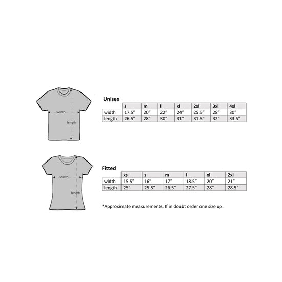 100% cotton and available in unisex and fitted sizes. When selecting your style and size, please refer to the sizing charts in the product photos. All measurements are in inches.