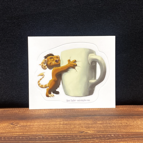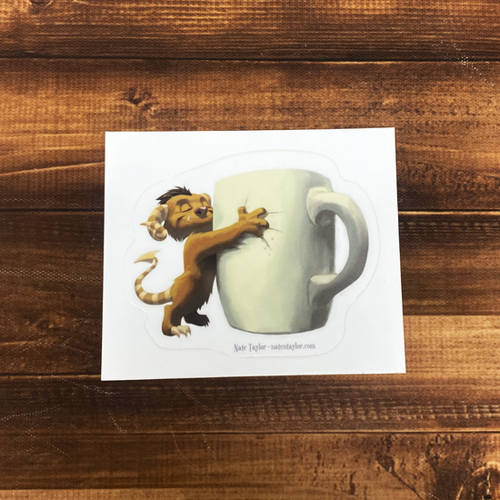 Show your love of your favorite addiction wherever you go with this sticker featuring Nate Taylor's Coffee Critter.