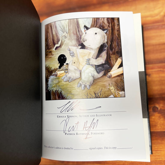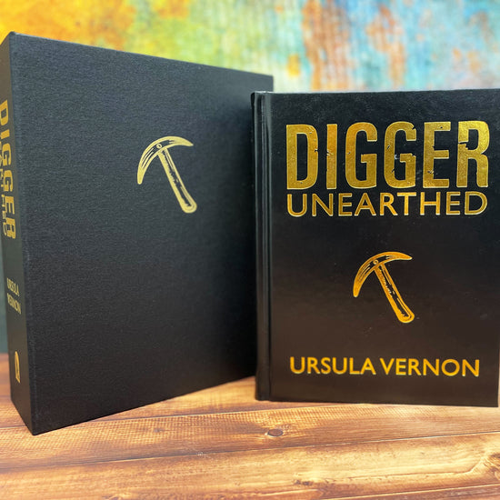 The ultimate edition of Digger: Unearthed is here! This gorgeous tome is the digitally remastered complete story of "Digger" along with a foreward by Patrick Rothfuss. This Collector's Edition was previously only available in the Kickstarter, so get yours now while you can! This leather-bound edition comes with a gold satin ribbon bookmark, ships inside a precious clamshell, and is signed by both Ursula Vernon and Patrick Rothfuss!