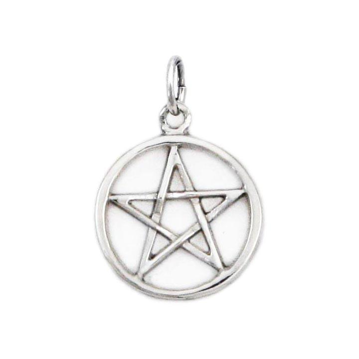 The pentacle charm measures 18.4 mm long, 15.5 mm wide, and 1.7 mm at the thickest point. The pentacle weighs 1.6 grams. Includes an un-soldered sterling silver jump ring. The back of the charm is textured and stamped with makers mark, copyright, and sterling.