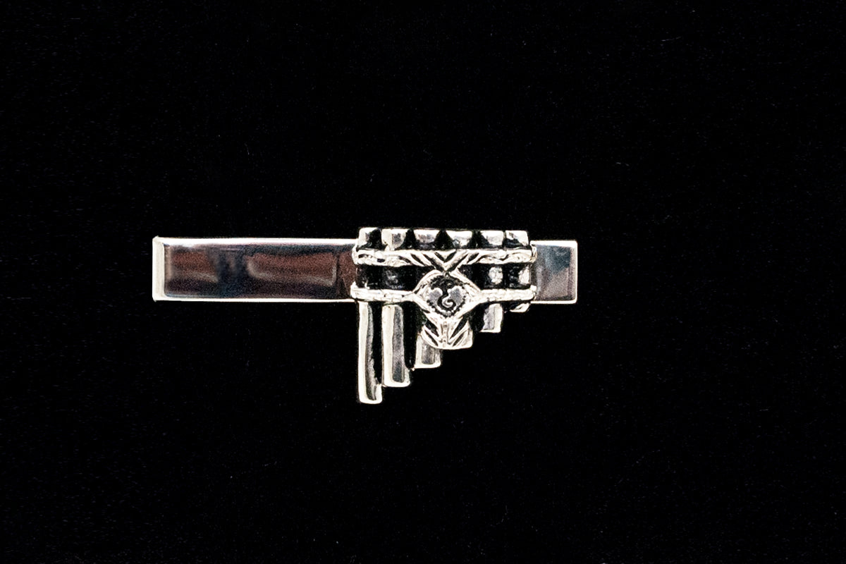 The Eolian Talent Pipes Tie Clip is solid sterling silver. The tie bar with clip measures 39.2 mm long by 5.6 mm wide. The pipes measure 16 mm at the longest point by 17.3 mm wide. The tie bar weighs 9.4 grams. The back of the pipes are stamped with our makers mark, copyright, and metal content.