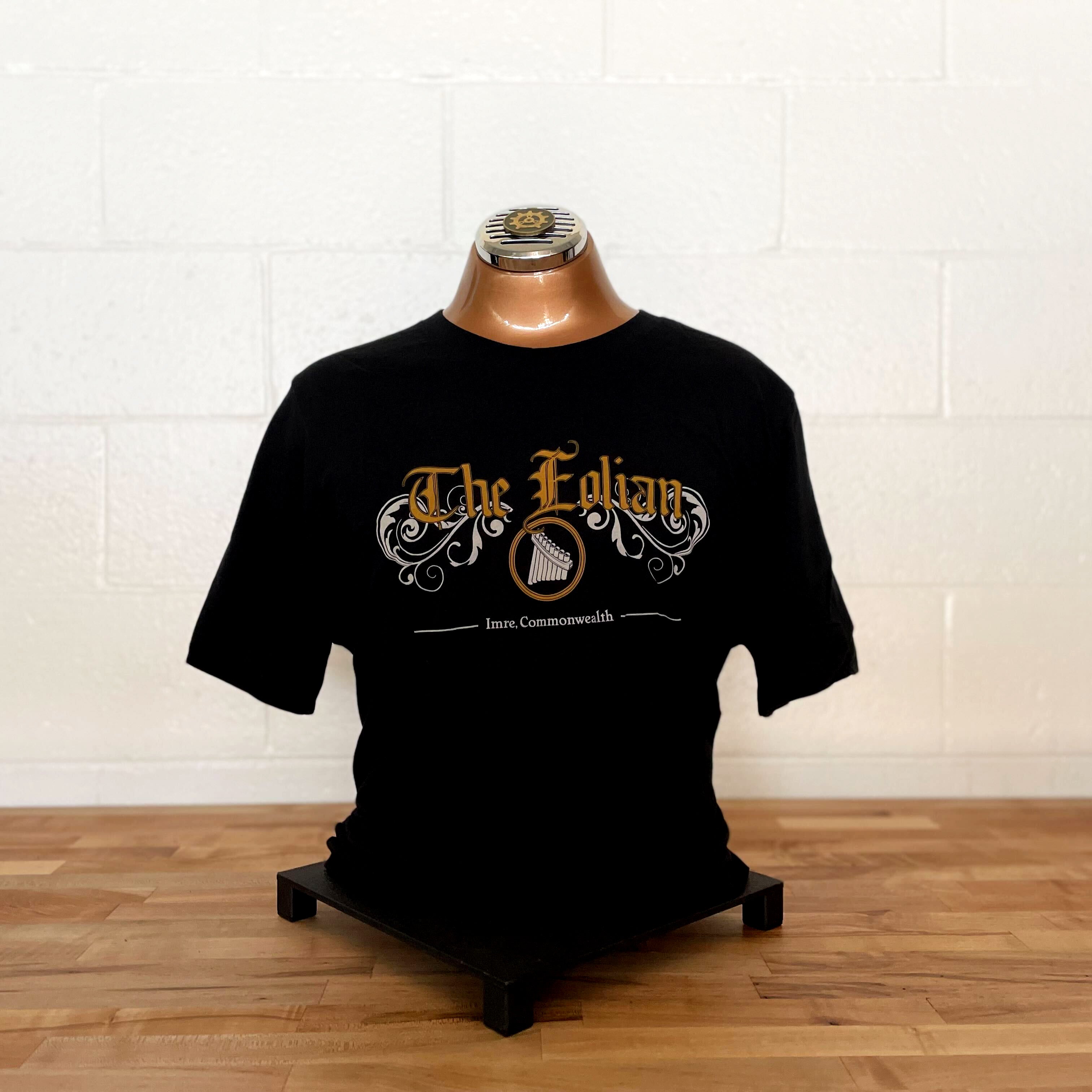 Stealthily declare your fandom of the Kingkiller Chronicle series by Patrick Rothfuss with this black t-shirt bearing the logo of the great Eolian Bar. This logo includes the bar name, location within the city of Imre in the Commonwealth, and the silver talent pipes that can be earned at the Eolian and displayed as a symbol of musical excellence.