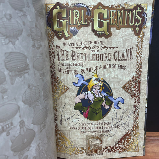 Girl Genius follows the career of Agatha Heterodyne--a hapless student at Transylvania Polygnostic University who discovers that she has more going for her than she thought. Get to know Agatha Clay and her mad science adventures with book one in the Girl Genius series. Signed by both Phil and Kaja Foglio.
