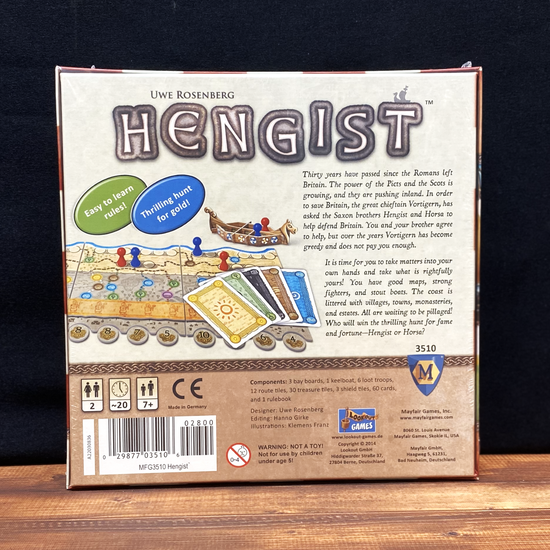 In Hengist, both players compete for the same treasure tiles. The player who reaches a treasure tile with one of his raiding groups first gets the tile — but a part of the road is hidden and must be explored first. Not always is the direct path the most successful way. The player who uses their cards wisely and has a little bit of luck will get the more valuable treasure tiles and win the game.
