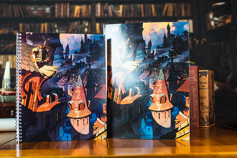 This matching set includes one folder and one notebook. Both the folder and the notebook feature the art Kvothe in Tarbean by Matt Rhodes, concept artist for Dragon Age: Inquisition, based on Patrick Rothfuss's Kingkiller Chronicle.
