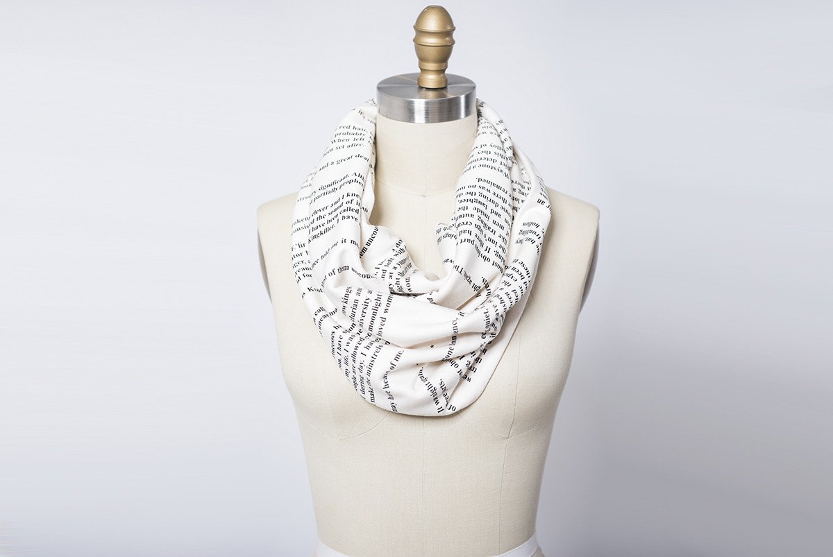 Produced by Storiarts, this book scarf is created from American-made 100% cotton jersey knit fabric. The fabric has been doubled over and sewn along the edge and at the center to create a thick, chunky, and moldable "page." The scarves are printed by hand and there may be variances in the darkness of the text. The ink has been heat set and will not wash out.