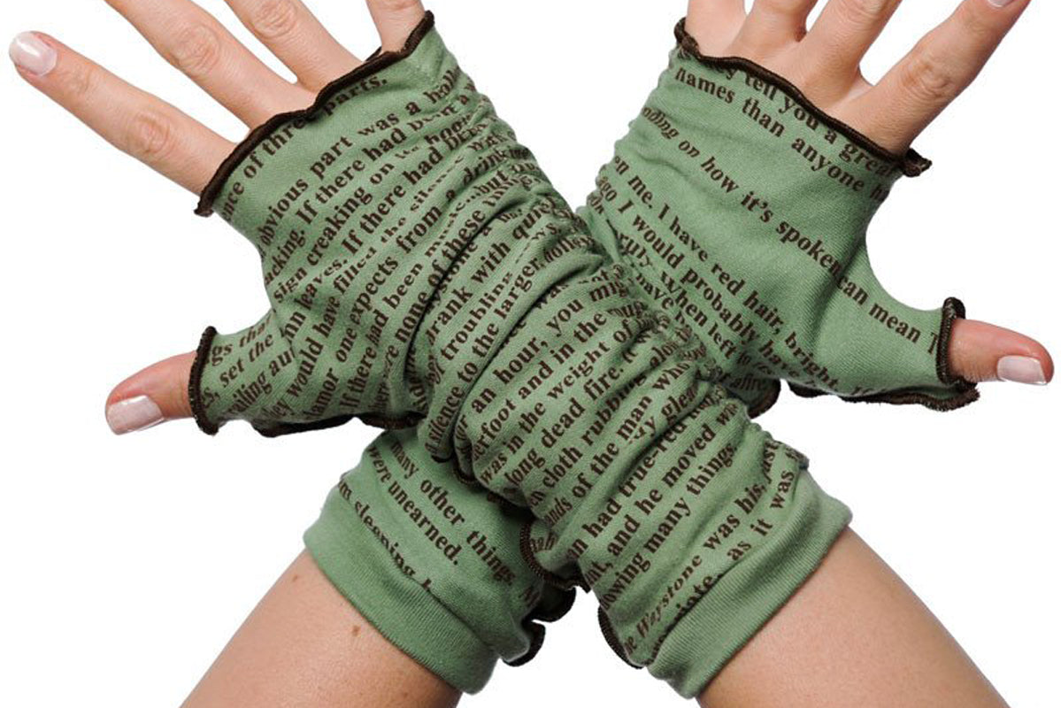 Produced by Storiarts, these writing gloves are created from American-made 100% cotton jersey knit fabric. The open palm circumference is about 8" and the arm band is about 7" around. When worn, they are roughly 7" long.
