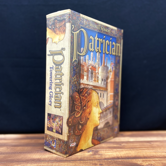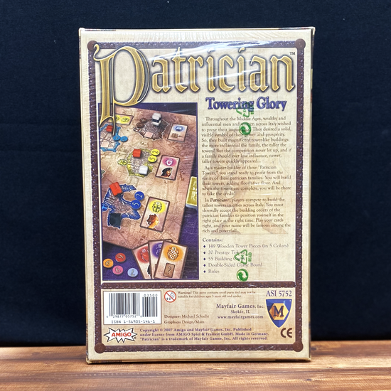 As a master builder of these "Patrician Towers", you stand ready to profit from the vanity of these patrician families. You will build their towers, adding floor after floor. And when the towers are complete, you will be there to take the credit. In Patrician, players compete to build the tallest towers in cities across Italy. You must shrewdly accept the building orders of the patrician families to position yourself in the right place at the right time. Play your cards right, and your name will be famous among the rich and powerful. Contents like 149 wooden tower pieces, 55 building cards, double-sided game board , 20 prestige tokens and rules.