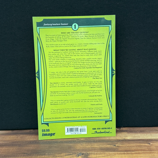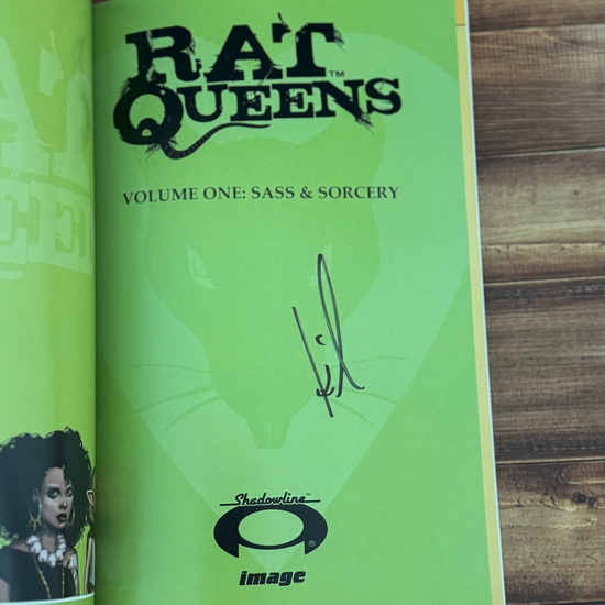 Who are the Rat Queens? They're a pack of booze-guzzling, death-dealing battle maidens-for-hire and they're in the business of killing all the god's creatures for profit. Meet Hannah the Rockabilly Elven Mage, Violet the Hipster Dwarven Fighter, Dee the Atheist Human Cleric and Betty the Hippy Smidgen Thief. Signed by author Kurtis Wiebe.