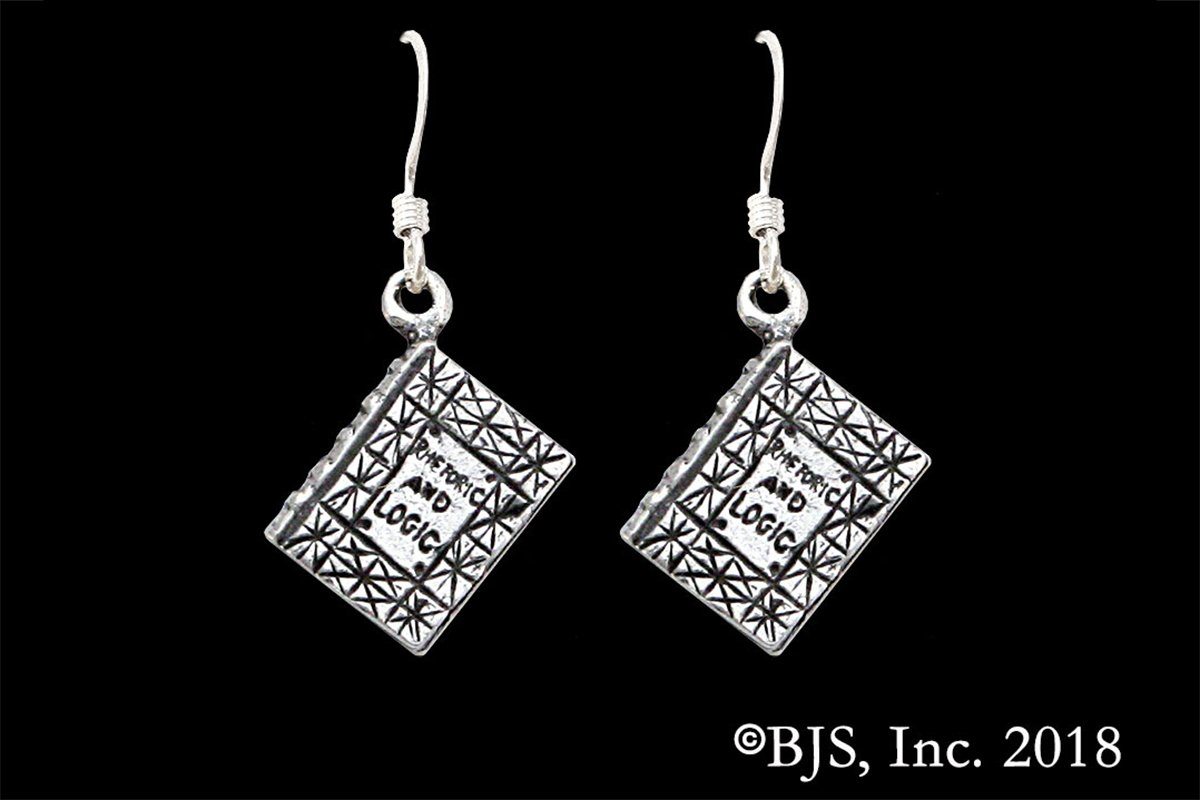 The book charms are solid sterling silver and measure approximately 12.8 mm long, 10.5 mm at the widest point, and 1.9 mm thick. The books are three dimensional and finished on all sides. The Rhetoric & Logic earrings weigh approximately 4.9 grams (2.4 grams each). Includes sterling silver ear wires. The page side of the book is stamped with Badali Jewelry's makers mark and copyright.