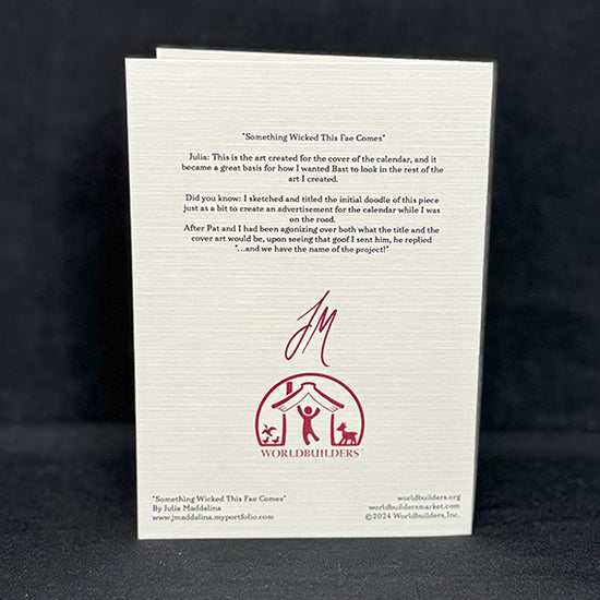 Can you ever get enough of our favorite Fae, Bast? Of course not, it’s pointless to resist! Help quench your thirst with a greeting card adorned with lovely art of one of Pat Rothfuss’s most beloved characters lovingly rendered by Worldbuilders collaborator Julia Maddalina. Keep your dehydration at bay with one of six beautiful cards, perfect for displaying on your mantle, or sending to your friends in their time of need.