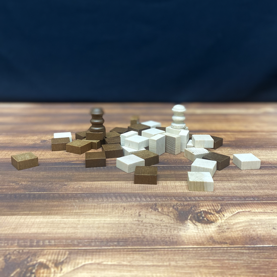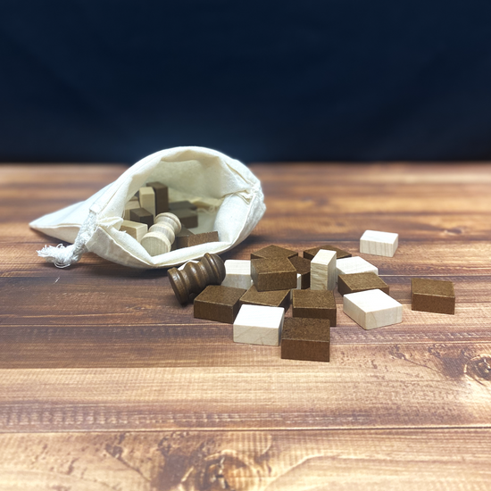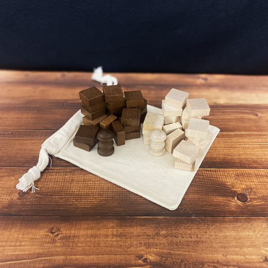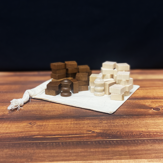 The Tavern Set is designed for portability, and includes a drawstring bag. This set is made of 44 compact wooden pieces, which is enough for a 5x5 game.
