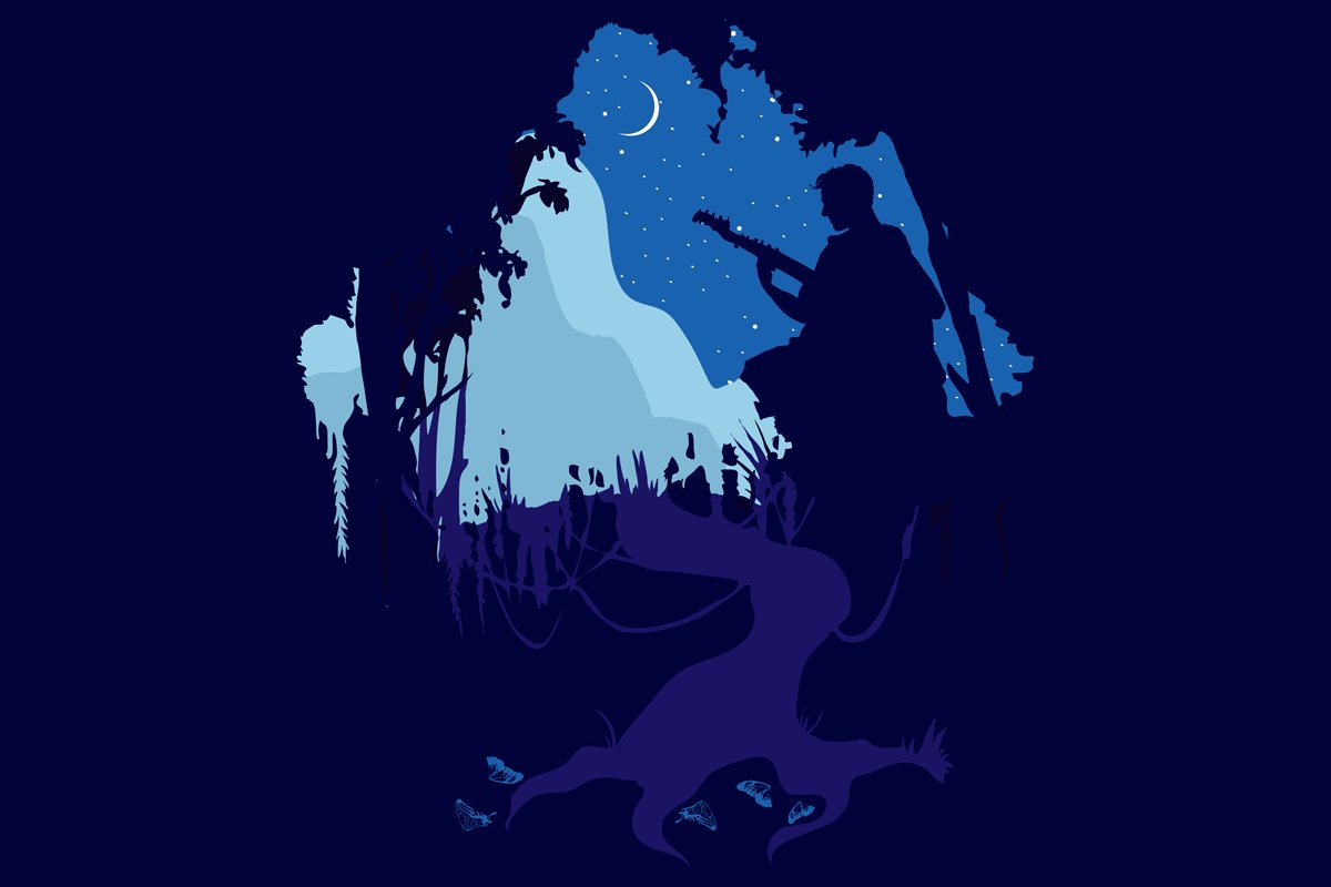 This illustration of The Cthaeh from the Kingkiller Chronicle series by Patrick Rothfuss comes to us from artist Cassie Meade, and blends well into the navy blue t-shirt that serves as its backdrop.