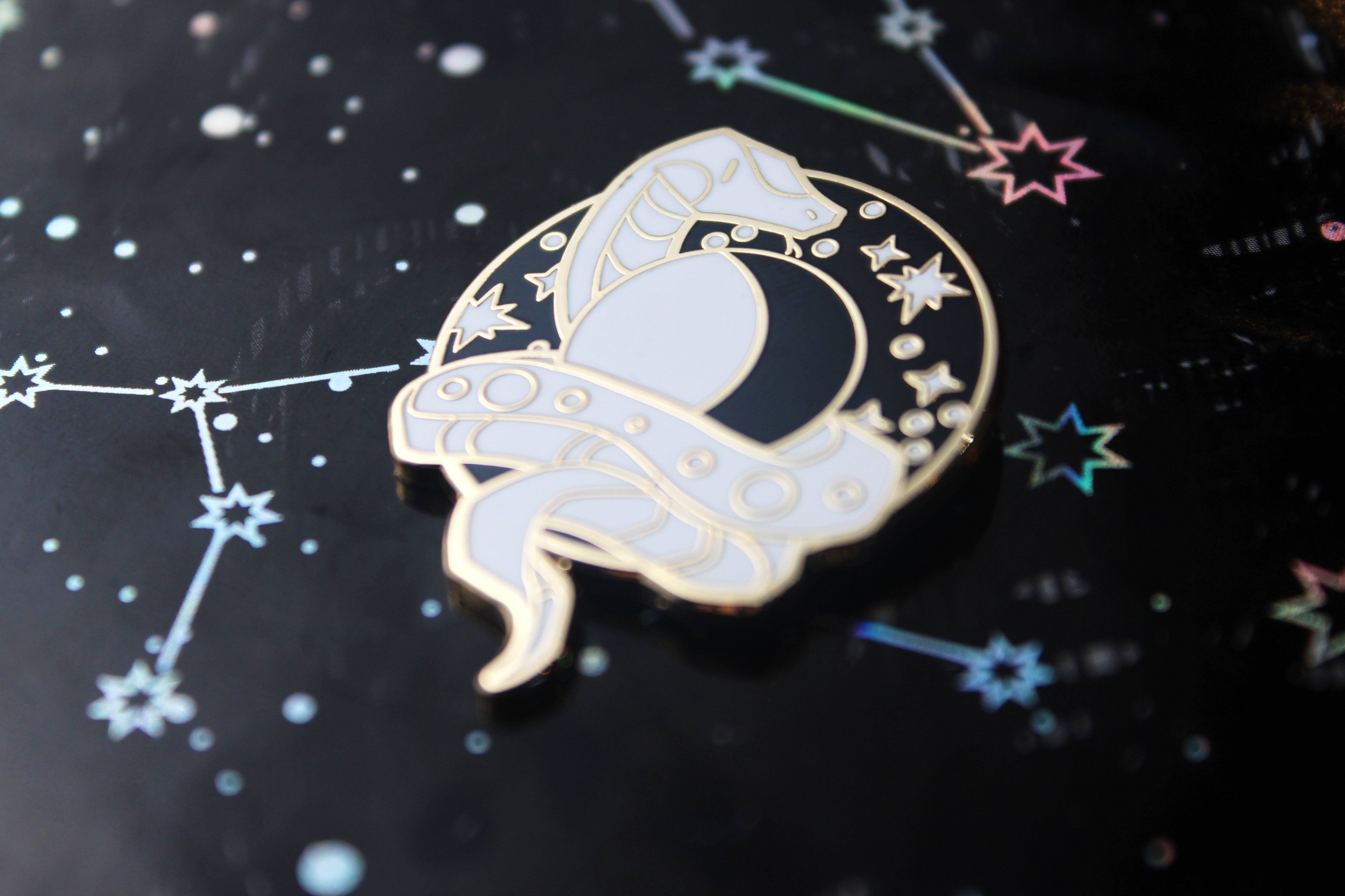 Celebrate your love of the worst man in all of fiction with this collection of hard enamel pins based on Travis Matagot’s animal forms. Jess Kuczynski created a gorgeous collection with a Travis for every season. What you see here is the pin representing his animal form for Spring: The Serpent!