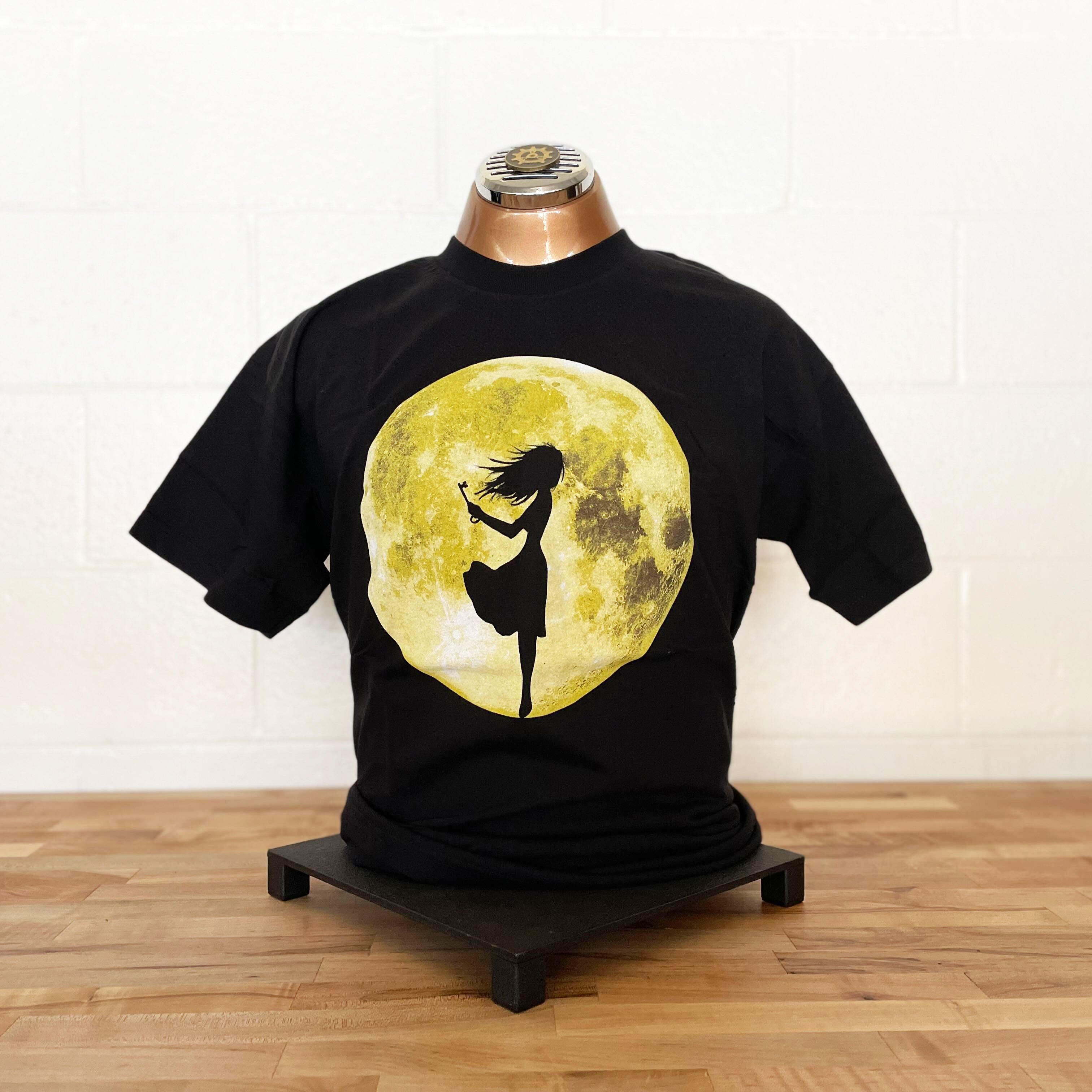 Auri, her beautiful form outlined by a yellow full moon, holds aloft a key in this moment from The Name of the Wind by Patrick Rothfuss, captured on this black t-shirt.