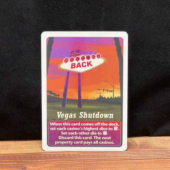 This card, Vegas Shutdown, is a rare promo card for the classic board game Lords of Vegas, from Lone Shark Games. It was released only in the Lords of Vegas: Underworld Kickstarter, as a charity benefit card. It requires any version of Lords of Vegas and the Underworld expansion to use. For more on the upcoming Lords of Vegas 6-Player Base Set and Americana expansion, go to lordsofvegas.com and sign up for updates!