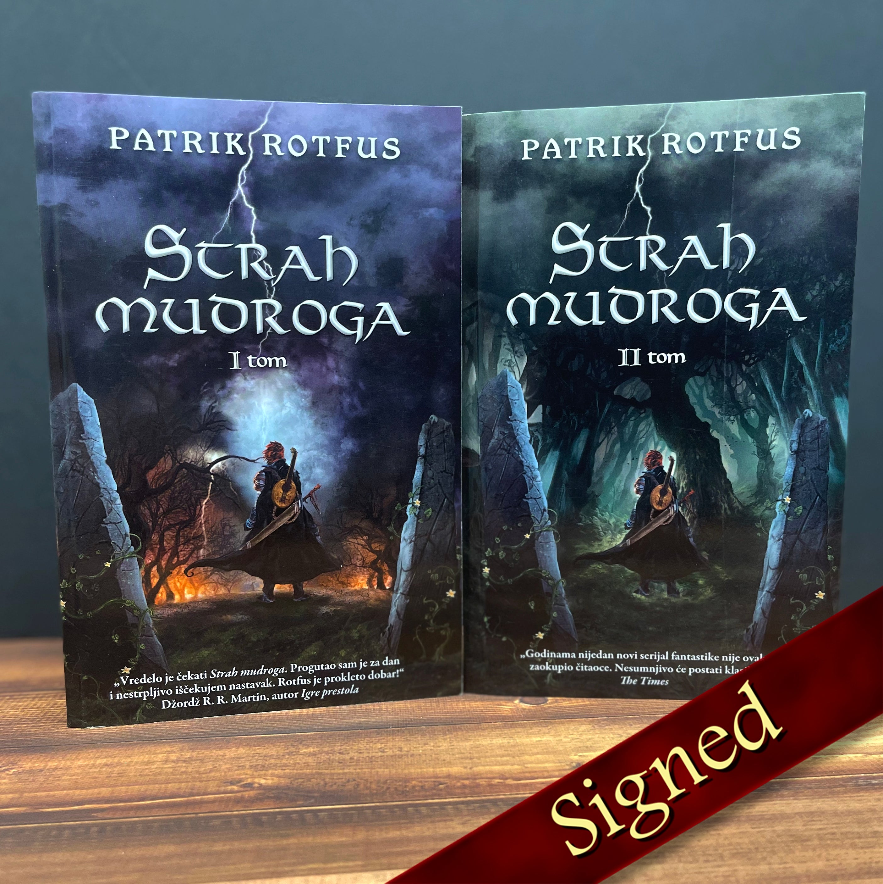 Strah Mudroga is the two-volume Serbian edition of The Wise Man's Fear by Patrick Rothfuss. Both volumes are available here as a set in trade paperback and will include Patrick's signature in both books.
